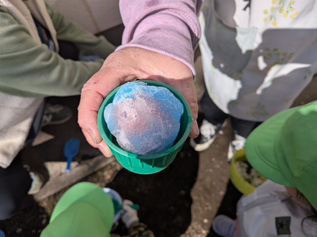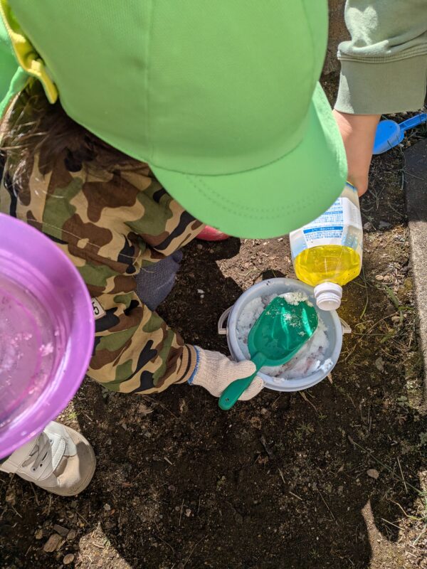 容器に雪を入れて食紅で作った色水をかけ、